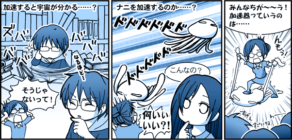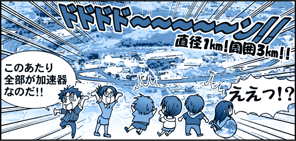 加速器というのは、素粒子っていうトンデモなく小さなものを加速する機械。