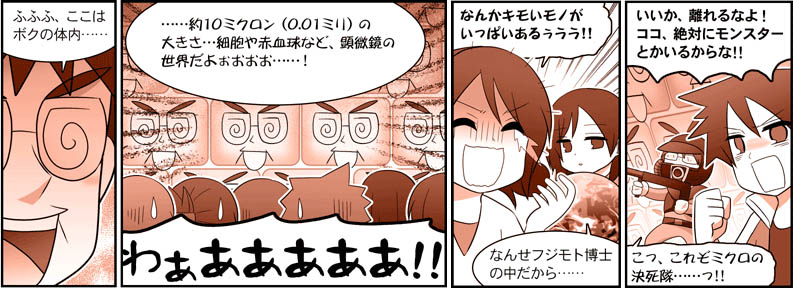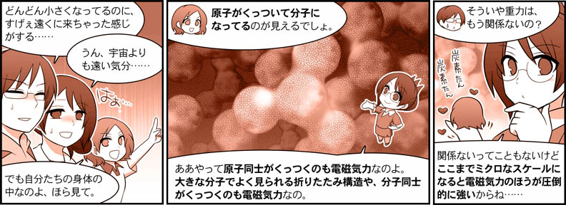 いやぁ、むりやりな屁理屈を考えてキッズたちに『ミクロの決死圏』をやってもらったんだけど、どんだけ小さくなってもず〜っと電磁気力のスケールなのよ。それで、強い力や弱い力が出てくるスケールに到達するまでに何ページもかかっちゃったのよ。