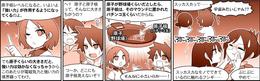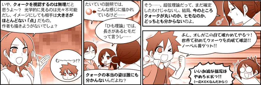 ちなみに、この「強い」とか「弱い」ってのは、電磁気力を基準にして「それより強い/弱い」ということで、重力は全部の中で一番弱い。だけど重力が弱くなっちゃうのは力の大部分が別の次元に漏れちゃってるせいで、本当はずっと強いとも言われていて、どうもややこしい。個人的には面白いと思うんだけど、まだはっきりしないことだから、それを前提にして漫画描くわけにもいかんしねぇ(苦笑)。